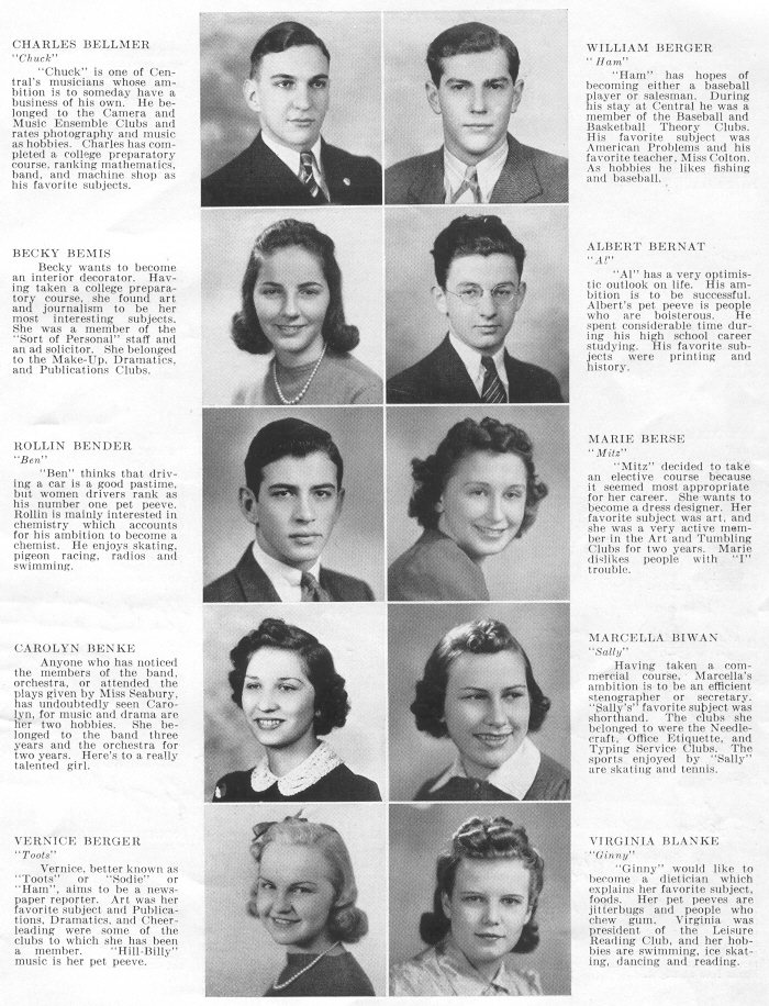 1940 Sheboygan Central High School, Page 13: Charles Bellmer, William Berger, Becky Bemis, Albert Bernat, Rollin Bender, Marie Berse, Carolyn Benke, Marcella Biwan, Vernice Berger, Virginia Blanke.