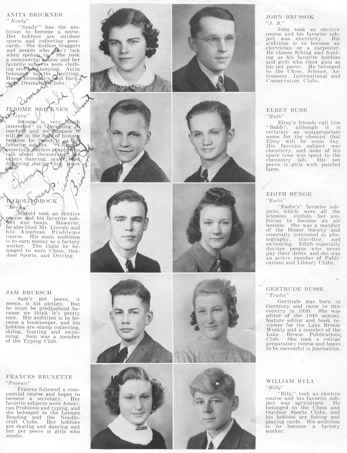 1940 Sheboygan Central High School, Page 15: Anita Brickner, John Brussok, Jerome Brickner, Elrey Bubb, Harold Brock, Edith Bunge, Sam Bruesch, Gertrude Busse, Frances Brunette, William Byla.