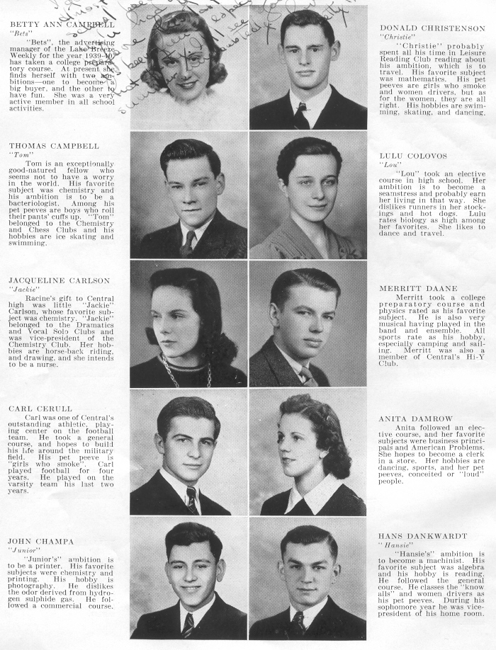 1940 Sheboygan Central High School, Page 16: Betty Campbell, Donald Christenson, Thomas Campbell, Lulu Colovos, Jacqueline Carlson, Merritt Daane, Carl Cerull, Anita Damrow, John Champa, Hans Dankwardt.