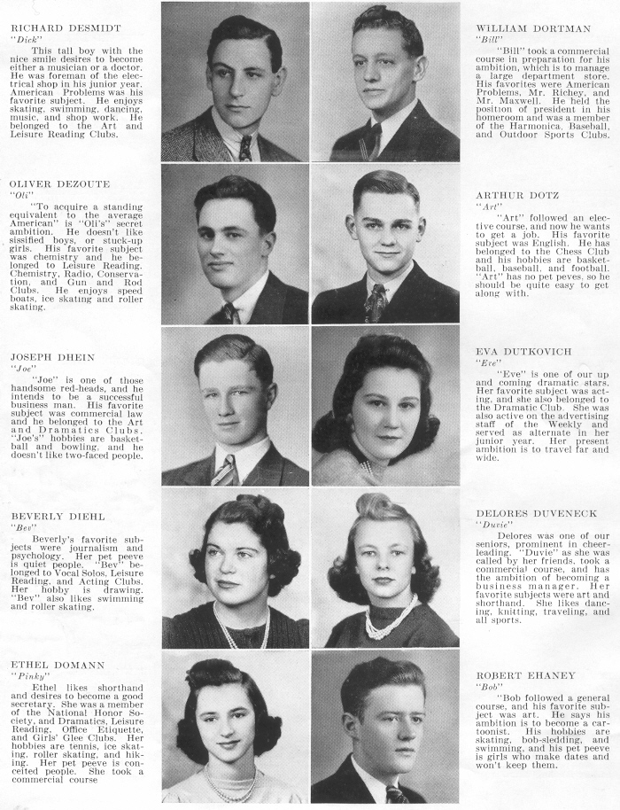 1940 Sheboygan Central High School, Page 18: Richard Desmidt, William Dortman, Oliver Dezoute, Arthur Dotz, Joseph Dhein, Eva Dutkovich, Beverly Diehl, Delores Duveneck, Ethel Domann, Robert Ehaney.