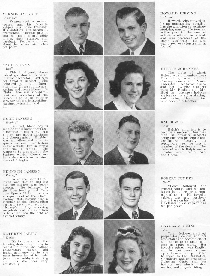 1940 Sheboygan Central High School, Page 26: Vernon Jackett, Howard Jerving, Angela Jank, Helene Johannes, Hugh Janssen, Ralph Jost, Kenneth Janssen, Robert Junker, Kathryn Japjec, Rayola Junkins.