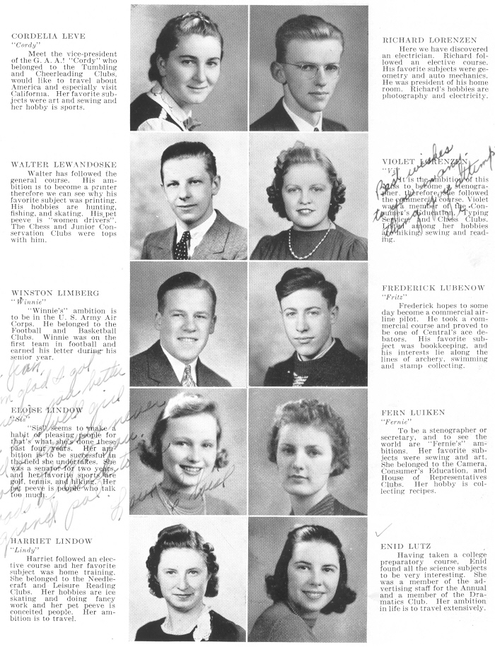 1940 Sheboygan Central High School, Page 31: Cordelia Leve, Richard Lorenzen, Walter Lewandoske, Violet Lorenzen, Winston Limberg, Frederick Lubenow, Eloise Lindow, Fern Luiken, Harriet Lindow, Enid Lutz.