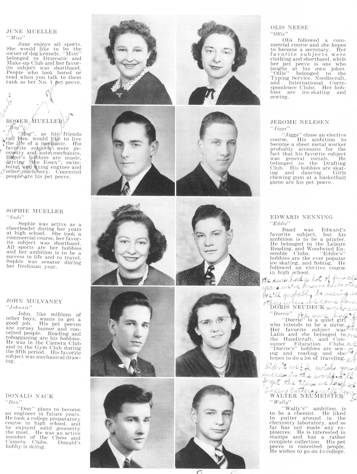 1940 Sheboygan Central High School, Page 34: June Mueller, Olis Neese, Roger Mueller, Jerome Nelesen, Sophie Mueller, Edward Nenning, John mulvaney, Doris Neudeck, Donald Nack, Walter Neumeister.