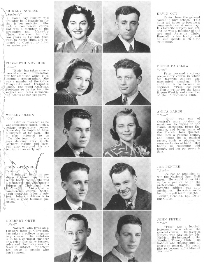 1940 Sheboygan Central High School, Page 35: Shirley Nourse, Ervin Ott, Elizabeth Novshek, Peter Pagelow, Wesley Olson, Anita Parisi, John Oppeneer, Joe Pentek, Norbert Orth, John Petek.