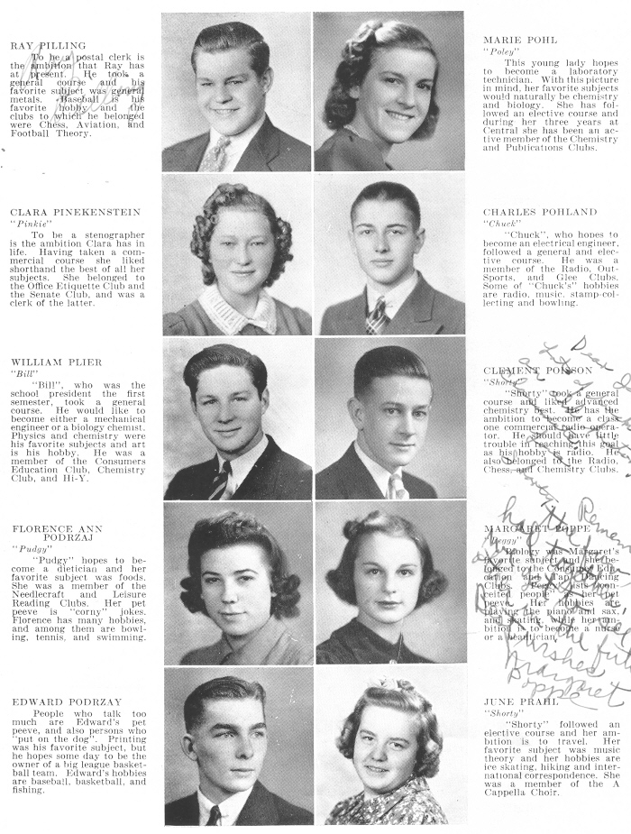 1940 Sheboygan Central High School, Page 36: Ray Pilling, Marie Pohl, Clara Pinekenstein, Charles Pohland, William Plier, Clement Poisson, Florence Podrzaj, Margaret Poppe, Edward Podrzay, June Prahl.
