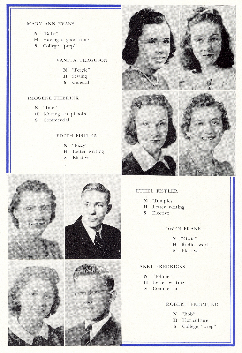 1940 Sheboygan North High School, Page 24: Mary Evans, Vanita Ferguson, Imogene Fiebrink, Edith Fistler, Ethel Fistler, Owen Frank, Janet Fredricks, Robert Freimund.