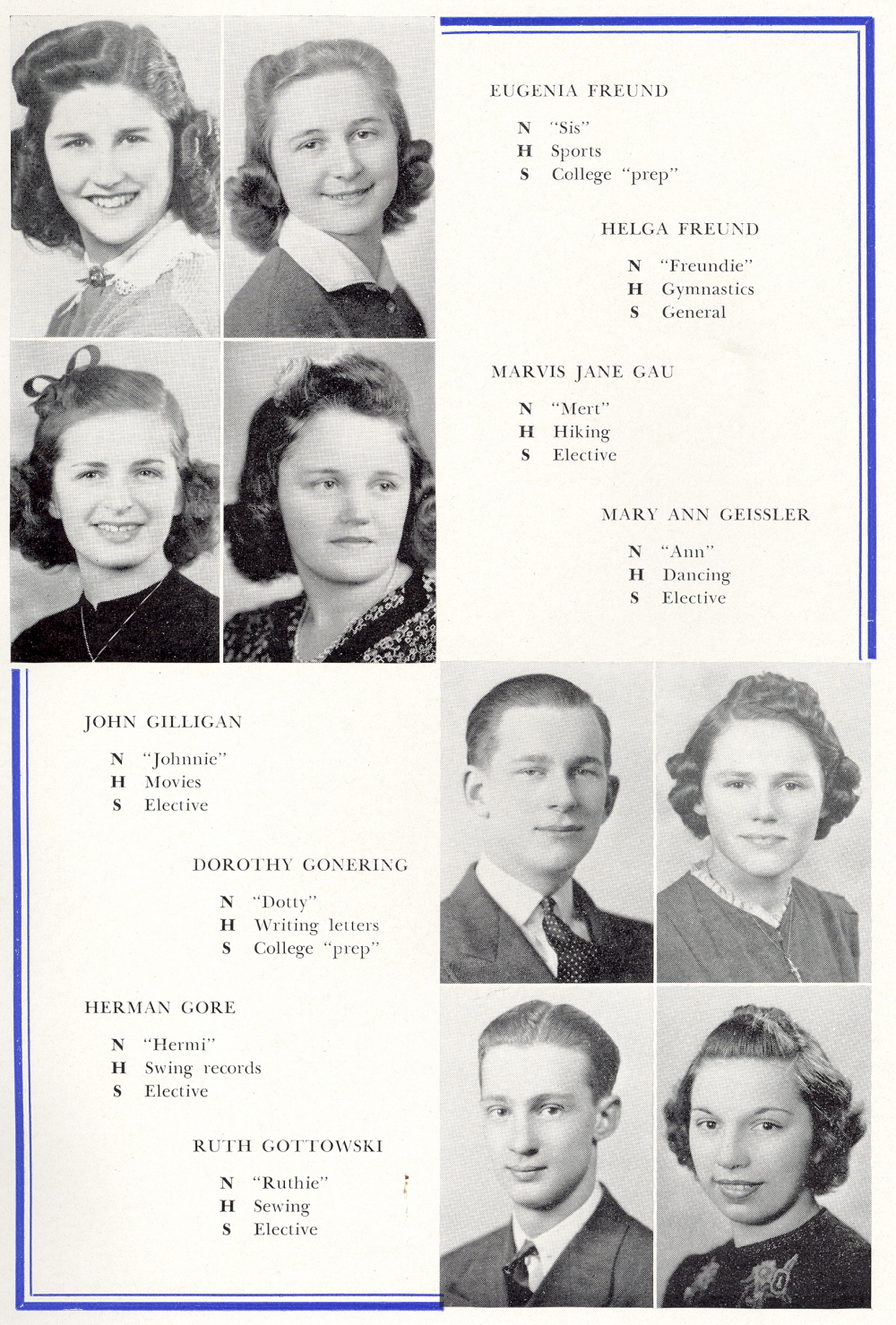 1940 Sheboygan North High School, Page 25: Eugenia Freund, Helga Freund, Marvis Gau, Mary Geissler, John Gilligan, Dorothy Gonering, Herman Gore, Ruth Gottowski.