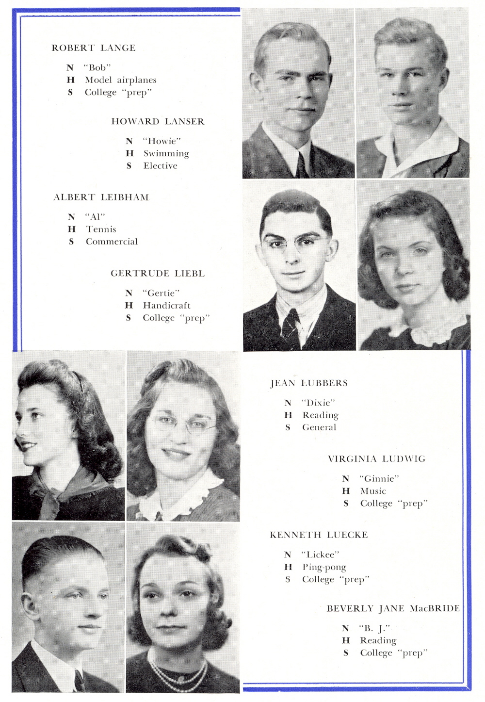 1940 Sheboygan North High School, Page 32: Robert Lange, Howard Lanser, Albert Leibham, Gertrude Liebl, Jean Lubbers, Virginia Ludwig, Kenneth Luecke, Beverly MacBride.