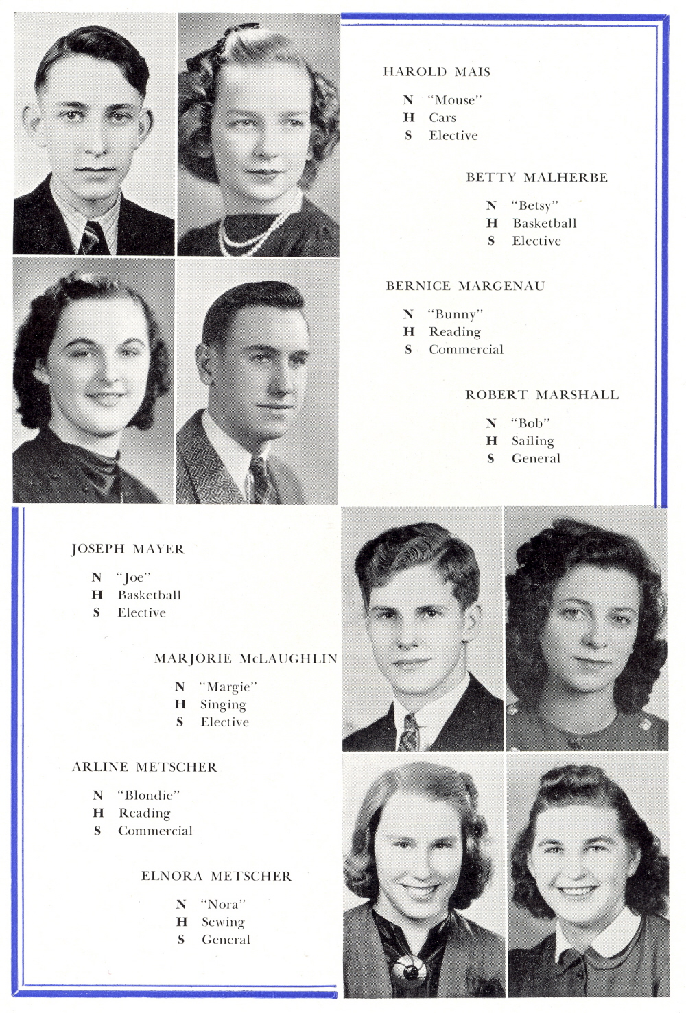 1940 Sheboygan North High School, Page 33: Harold Mais, Betty Malherbe, Bernice Margenau, Robert Marshall, Joseph Mayer, Marjorie McLaughlin, Arline Metscher, Elnora Metscher.