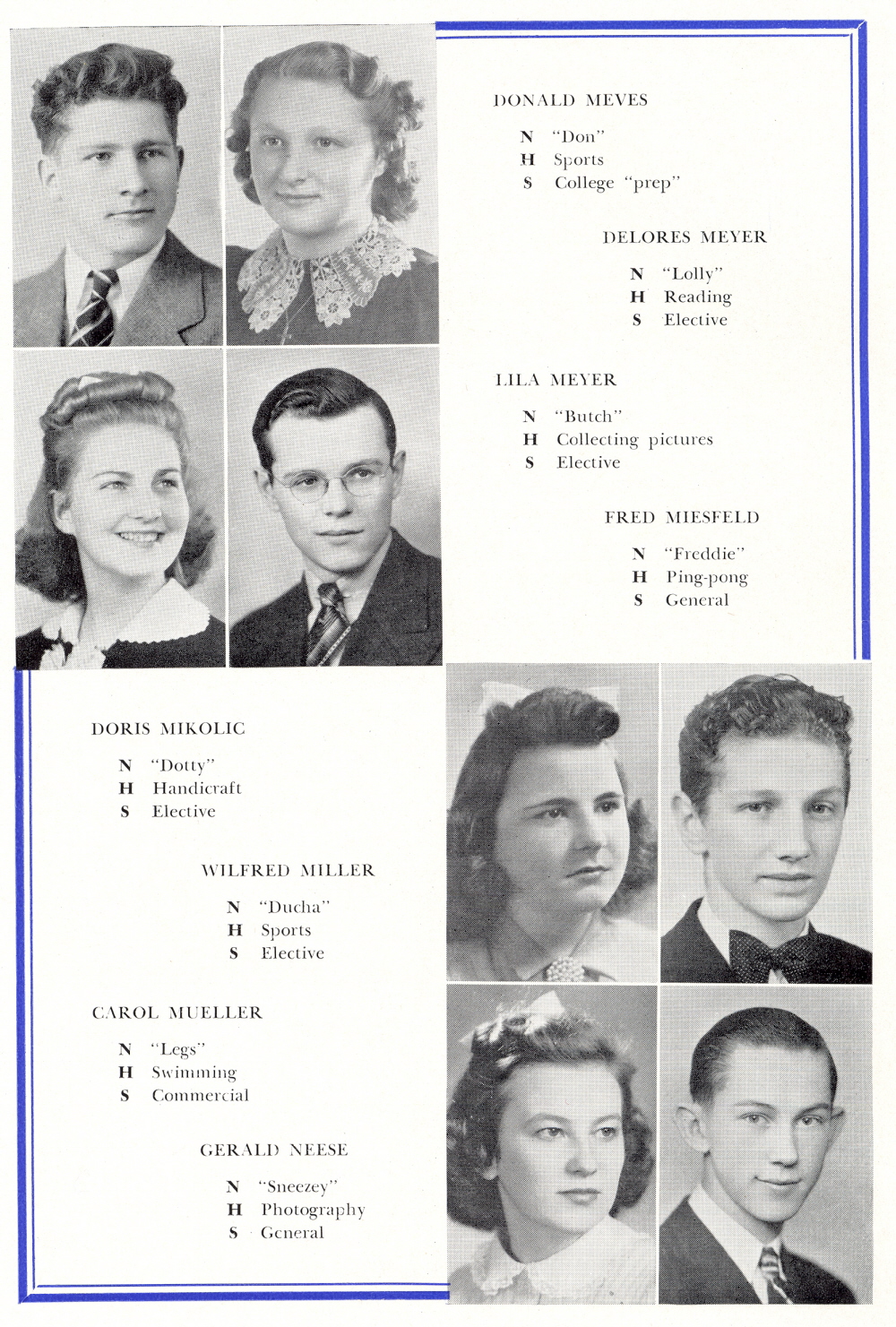1940 Sheboygan North High School, Page 34: Donald Meves, Delores Meyer, Lila Meyer, Fred Miesfeld, Doris Mikolic, Wilfred Miller, Carol Mueller, Gerald Neese.