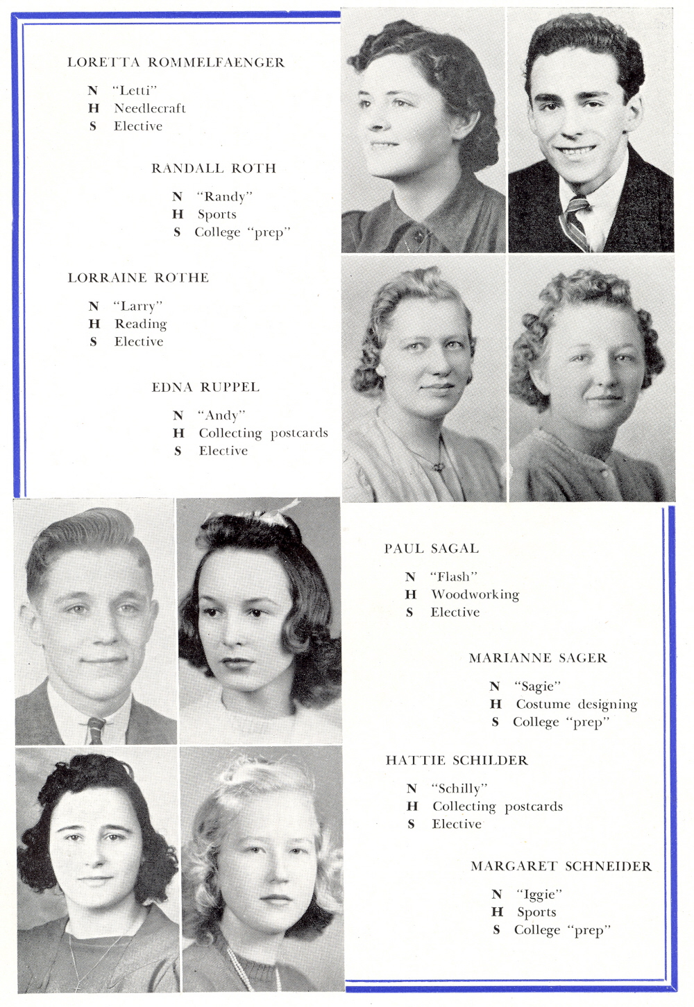 1940 Sheboygan North High School, Page 39: Loretta Rommelfaenger, Randall Roth, Lorraine Rothe, Edna Ruppel, Paul Sagal, Marianne Sager, Hattie Schilder, Margaret Schneider.