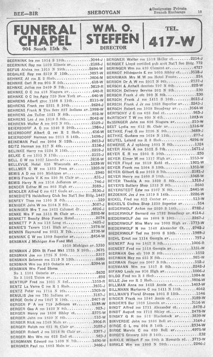 1940 Sheboygan Telephone Book, Page 10: