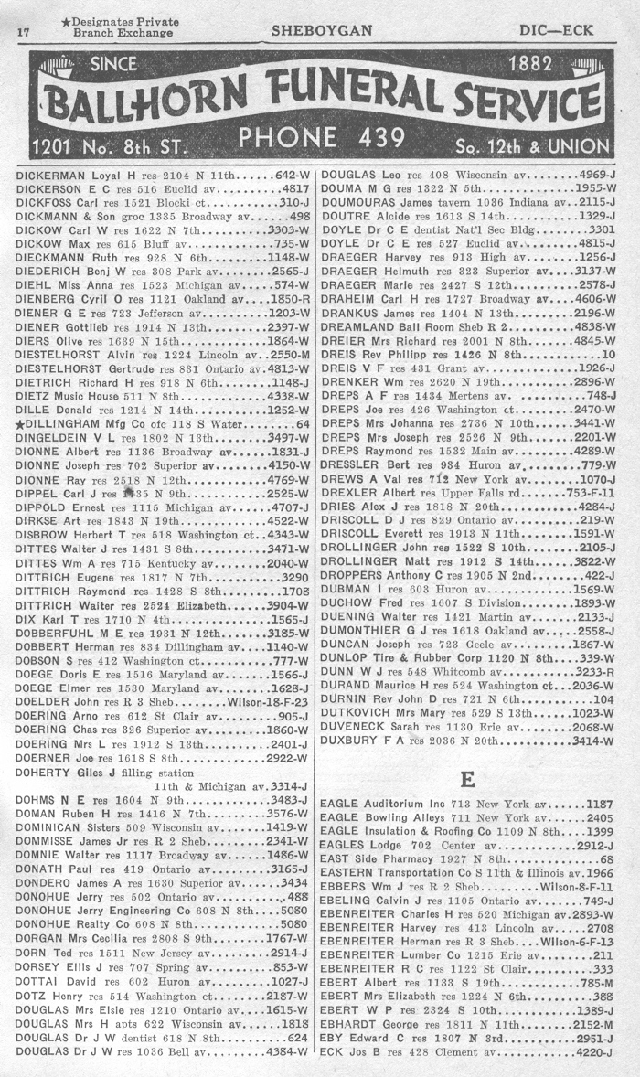 1940 Sheboygan Telephone Book, Page 17: