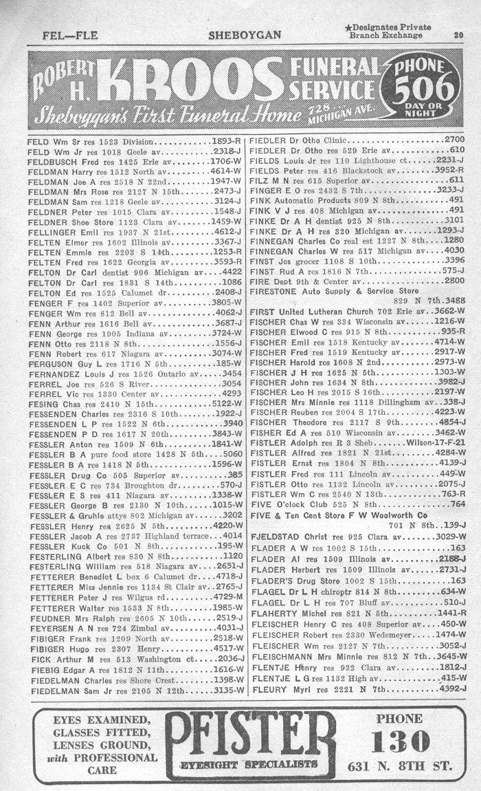 1940 Sheboygan Telephone Book, Page 20: