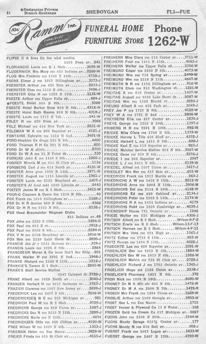 1940 Sheboygan Telephone Book, Page 21: