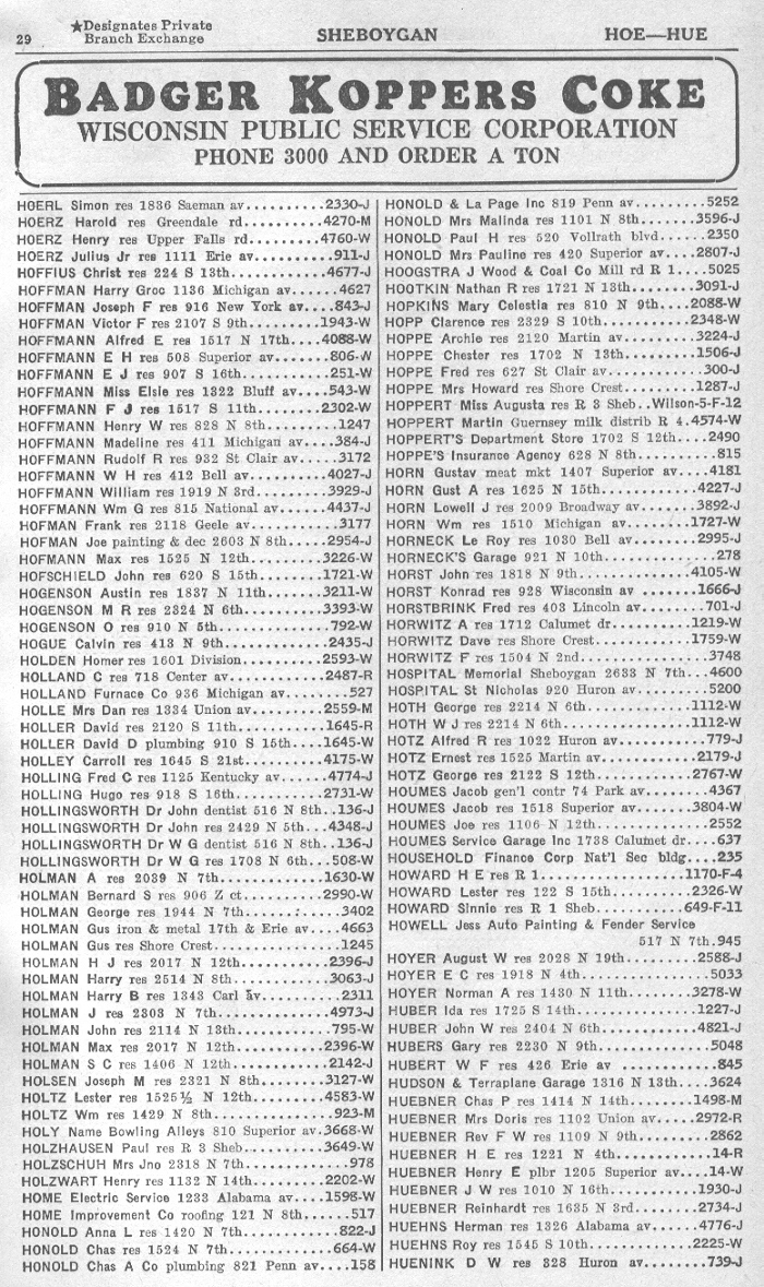 1940 Sheboygan Telephone Book, Page 29:
