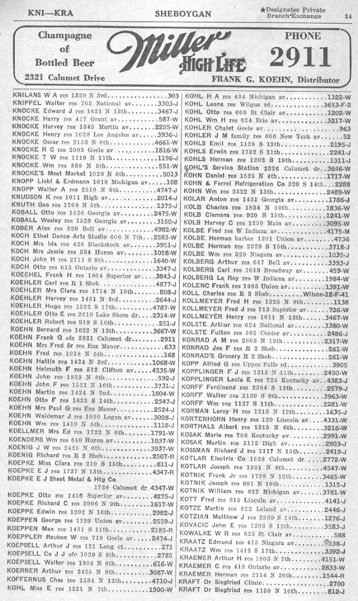 1940 Sheboygan Telephone Book, Page 34: