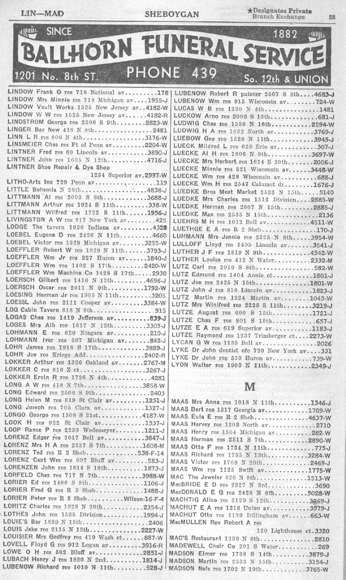 1940 Sheboygan Telephone Book, Page 38: