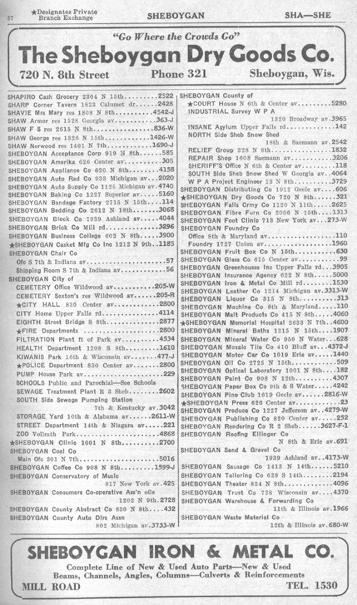 1940 Sheboygan Telephone Book, Page 57: