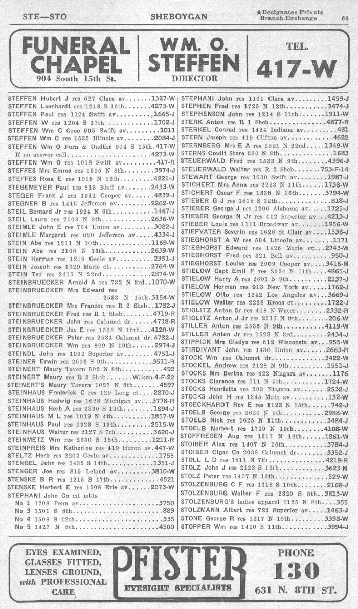 1940 Sheboygan Telephone Book, Page 60: