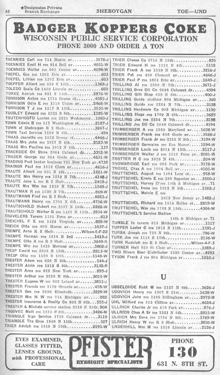 1940 Sheboygan Telephone Book, Page 63: