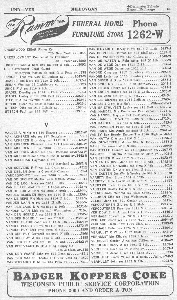 1940 Sheboygan Telephone Book, Page 64: