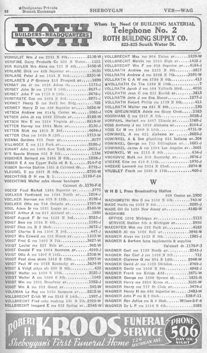 1940 Sheboygan Telephone Book, Page 65: