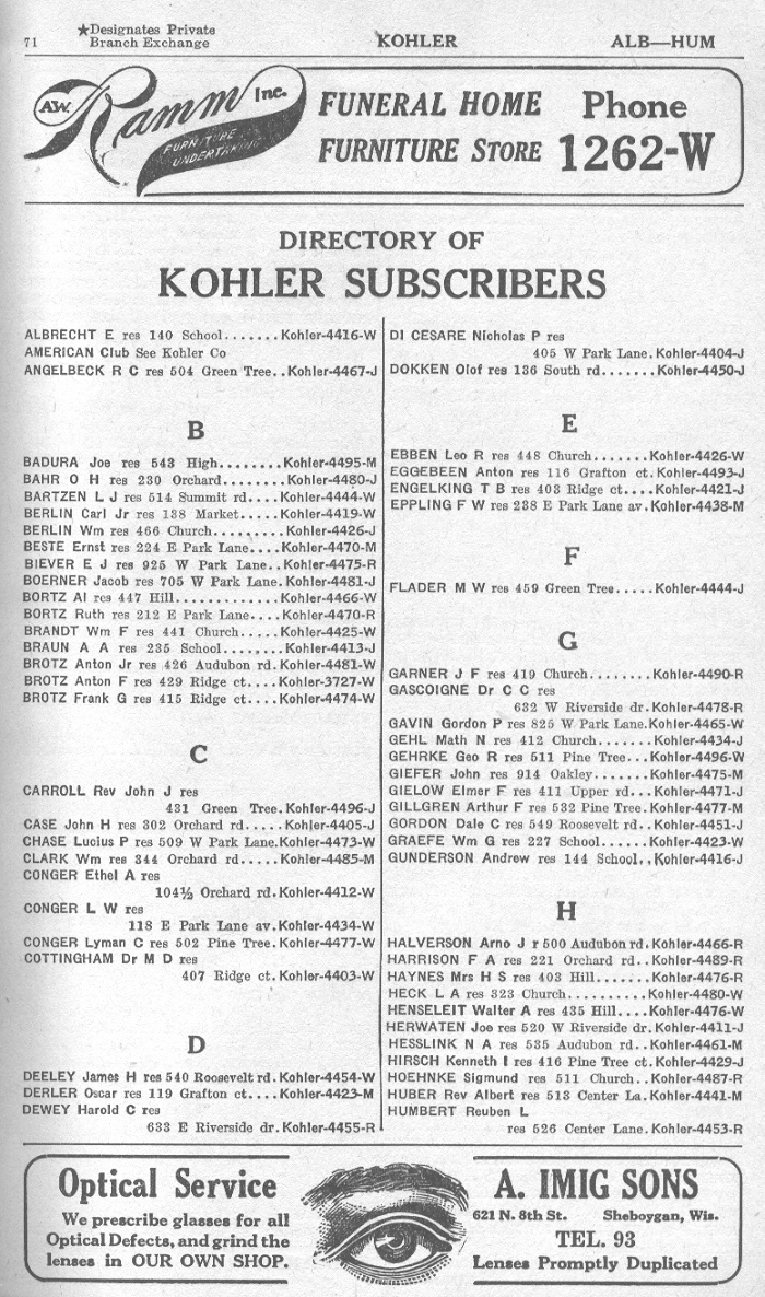 1940 Kohler Telephone Book, Page 71: