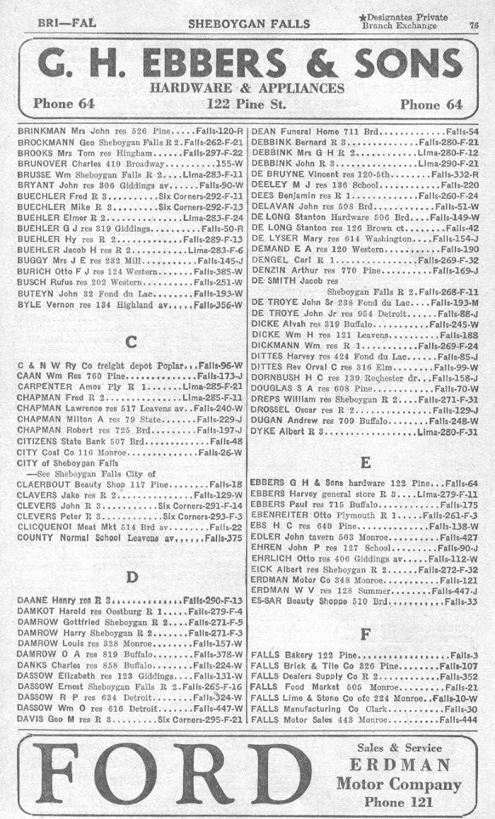 1940 Sheboygan Falls Telephone Book, Page 76: