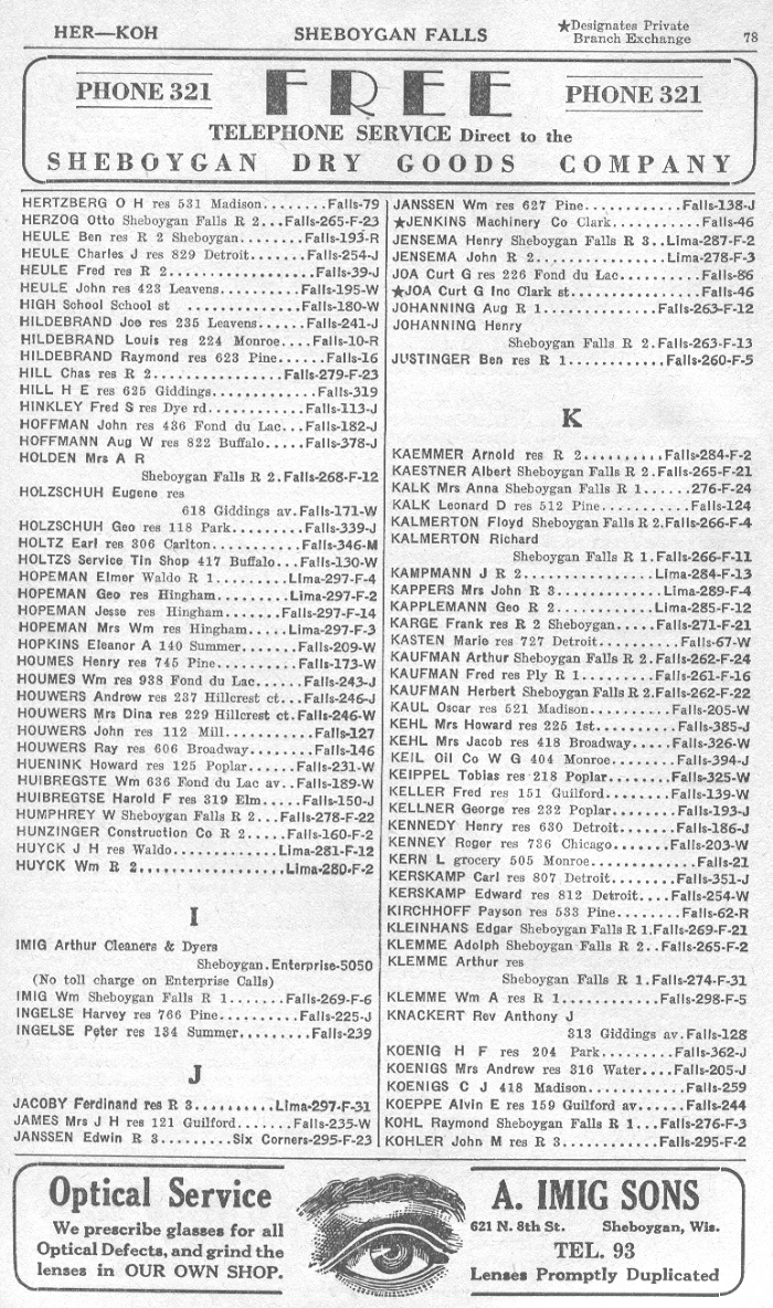 1940 Sheboygan Falls Telephone Book, Page 78: