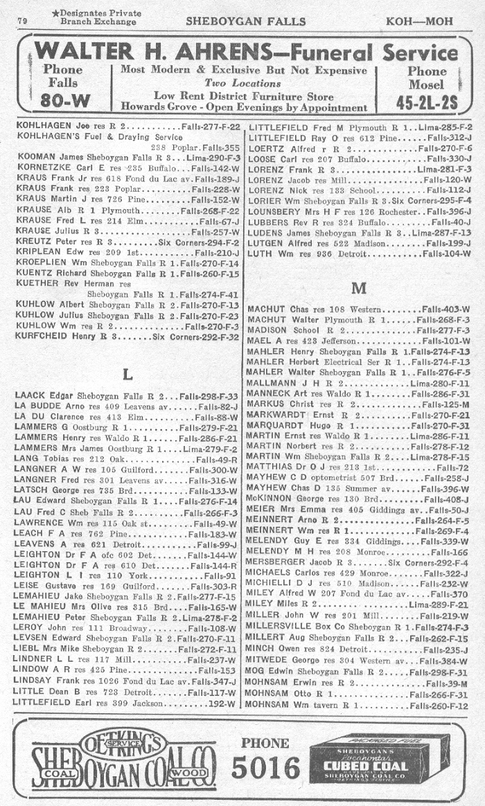 1940 Sheboygan Falls Telephone Book, Page 79: