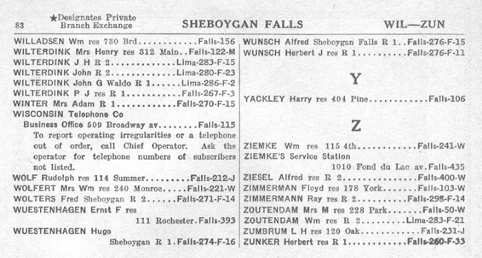 1940 Sheboygan Falls Telephone Book, Page 83:
