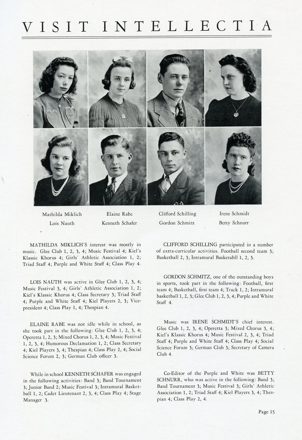 1941 Kiel High School, Page 15: Mathilda Miklich, Lois Nauth, Elaine Rabe, Kenneth Schafer, Clifford Schilling, Gordon Schmitz, Irene Schmidt, Betty Schnurr.