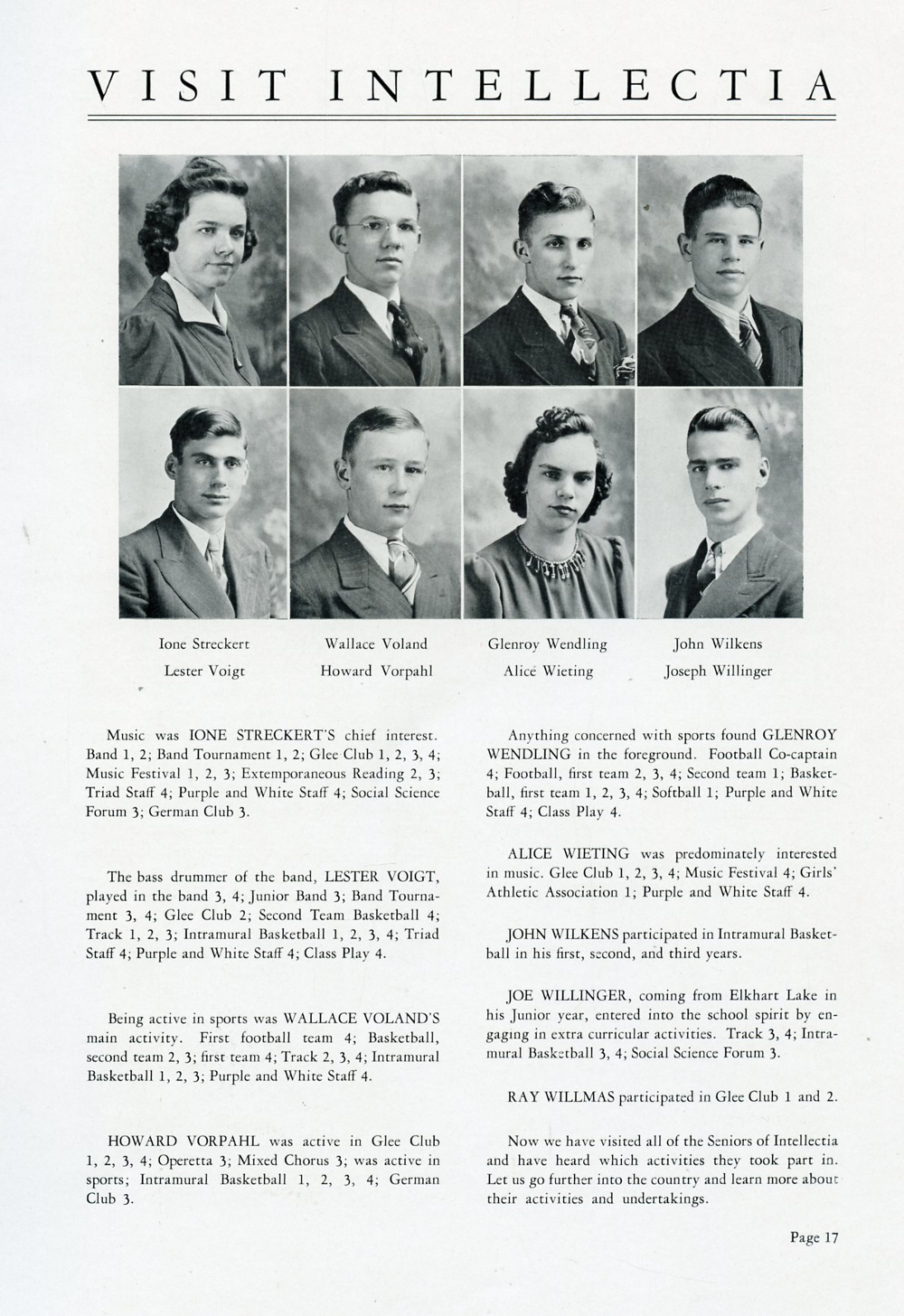 1941 Kiel High School, Page 17: Ione Streckert, Lester Voigt, Wallace Voland, Howard Vorpahl, Glenroy Wendling, Alice Wieting, John Wilkens, Joseph Willinger.