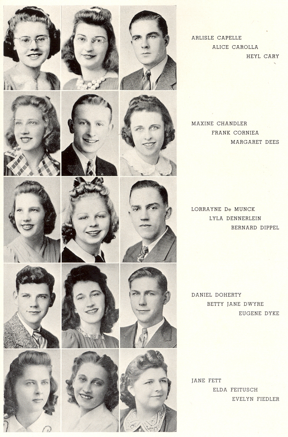 1941 Plymouth High School, Page 25: Arlisle Capelle, Alice Carolla, Heyl Cary, Maxine Chandler, Frank Corniea, Margaret Dees, Lorrayne De Munck, Lyla Dennerlein, Bernard Dippel, Daniel Doherty, Betty Dwyre, Eugene Dyke, Jane Fett, Elda Feitusch, Evelyn Fiedler.
