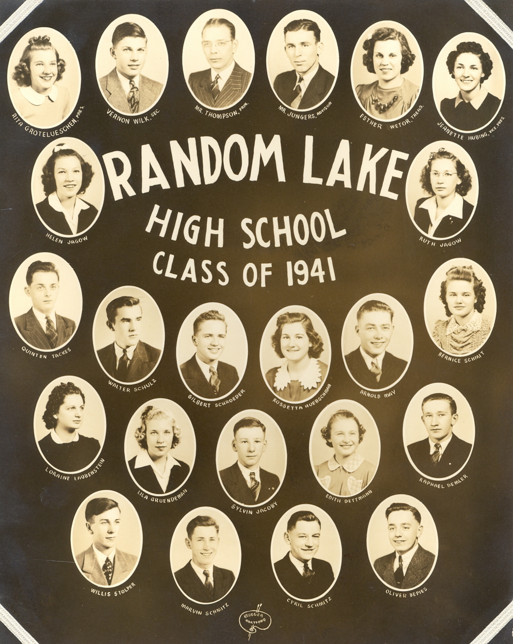1941 Random Lake High School, Page 15: Rita Grotelueschen, Vernon Wilk, Esther Wetor, Jeanette Hubing, Helen Jagow, Ruth Jagow, Quinten Tackes, Walter Schulz, Gilbert Schroeder, Rossetta Huebschman, Arnold May, Bernice Schmit, Loraine Laubenstein, Lila Gruendeman, Sylvin Jacoby, Edith Dettmann, Raphael Demler, Willis Stolper, Marvin Schmitz, Cyril Schmitz, Oliver Depies.
