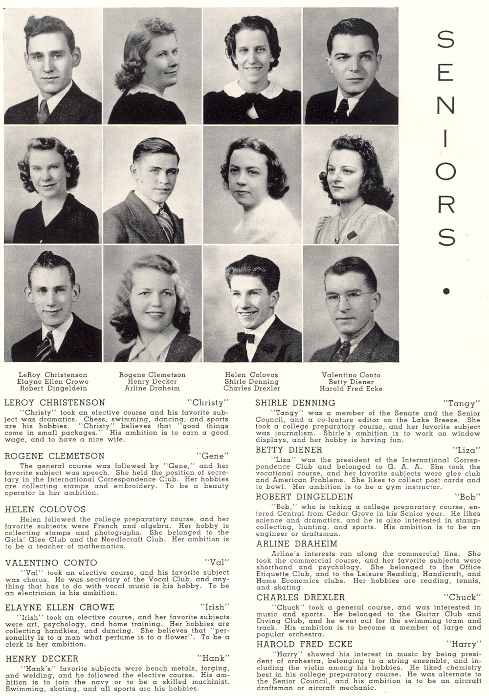 1941 Sheboygan Central High School, Page 20: Leroy Christenson, Rogene Clemetson, Helen Colovos, Valentino Conto, Elayne Ellen Crowe, Henry Decker, Shirle Denning, Betty Diener, Robert Dingeldein, Arline Draheim, Charles Drexler, Harold Fred Ecke.