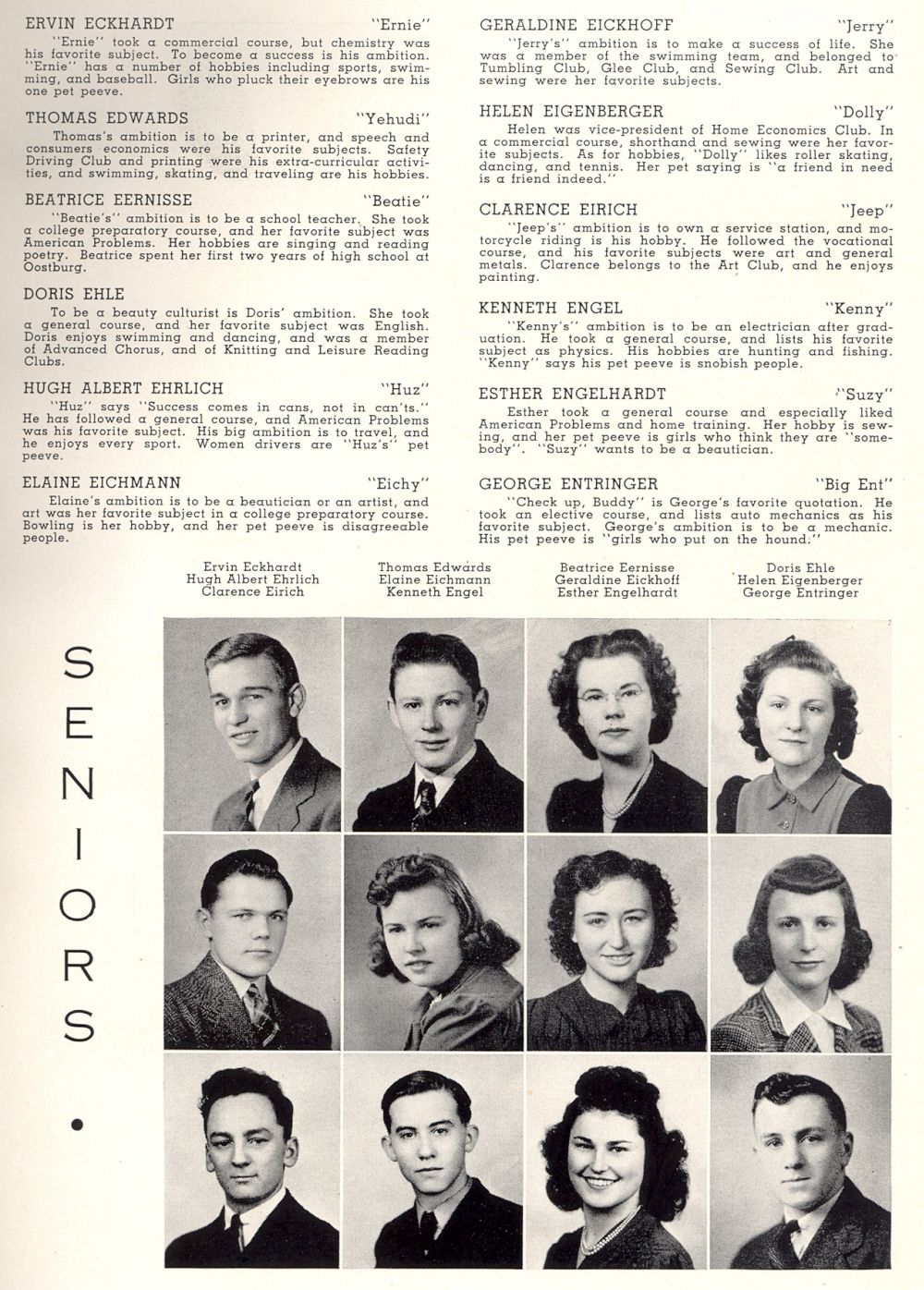 1941 Sheboygan Central High School, Page 21: Ervin Eckhardt, Thomas Edwards, Beatrice Eernisse, Doris Ehle, Hugh Albert Ehrlich, Elaine Eichmann, Geraldine Eickhoff, Helen Eigenberger, Clarence Eirich, Kenneth Engel, Esther Engelhardt, George Entringer.