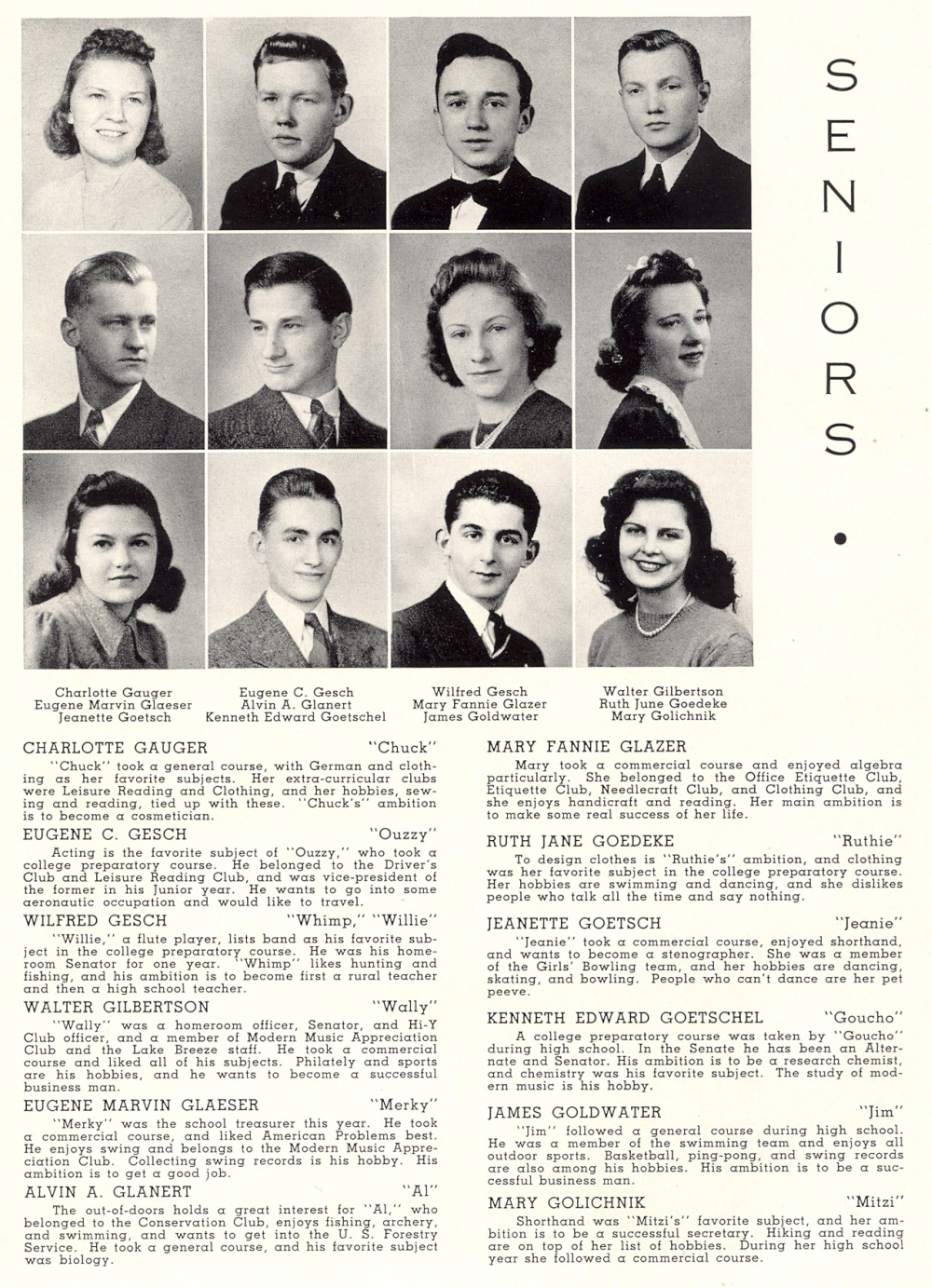 High School, Page 24: Charlotte Gauger, Eugene C. Gesch, Wilfred Gesch, Walter Gilbertson, Eugene Marvin Glaeser, Alvin A. Glanert, Mary Fannie Glazer, Ruth Jane Goedeke, Jeanette Goetsch, Kenneth Edward Goetschel, James Goldwater, Mary Golichnik.