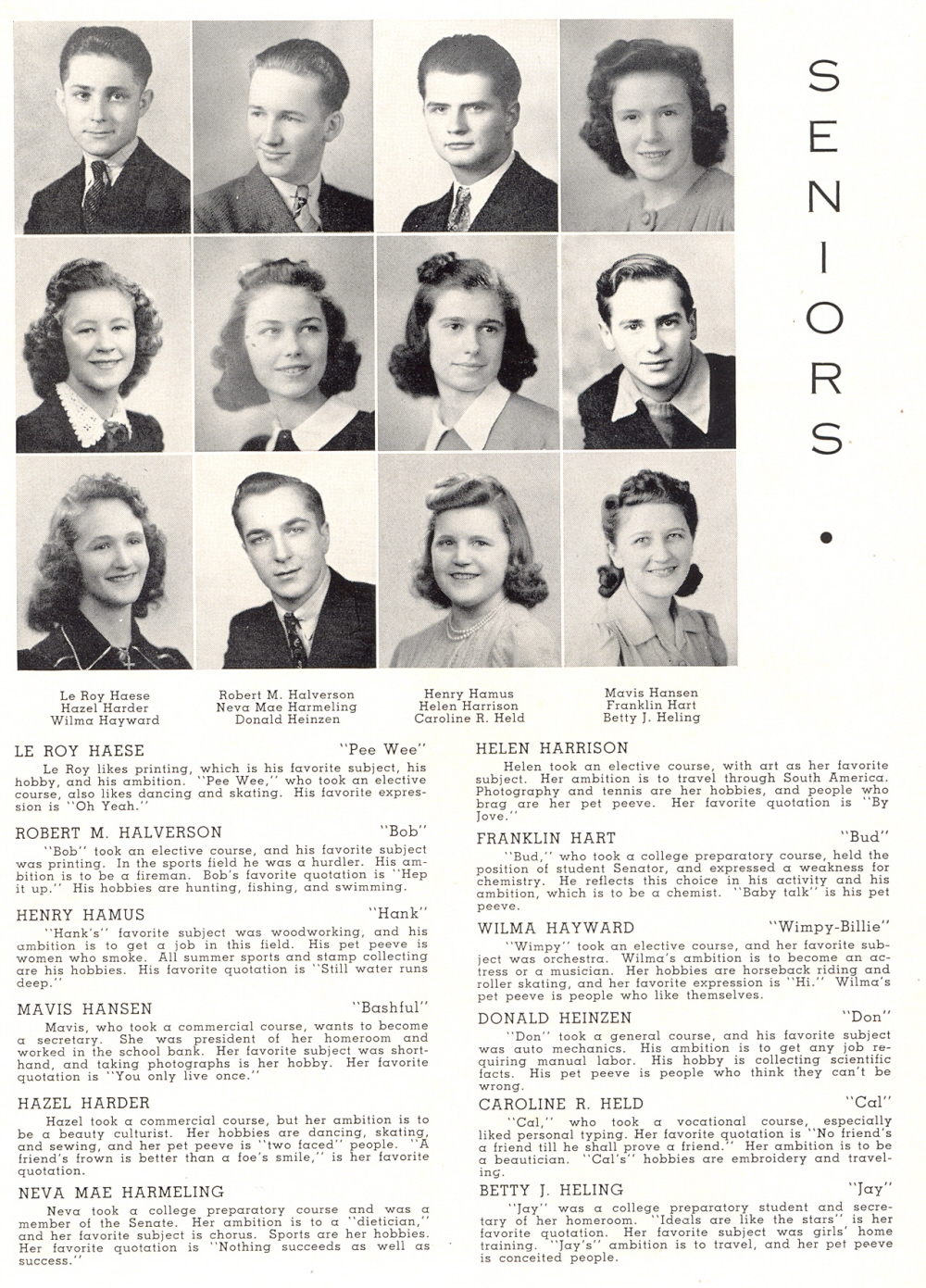 1941 Sheboygan Central High School, Page 26: Le Roy Haese, Robert M. Halverson, Henry Hamus, Mavis Hansen, Hazel Harder, Neva Mae Harmeling, Helen Harrison, Franklin Hart, Wilma Hayward, Donald Heinzen, Caroline R. Held, Betty J. Heling.