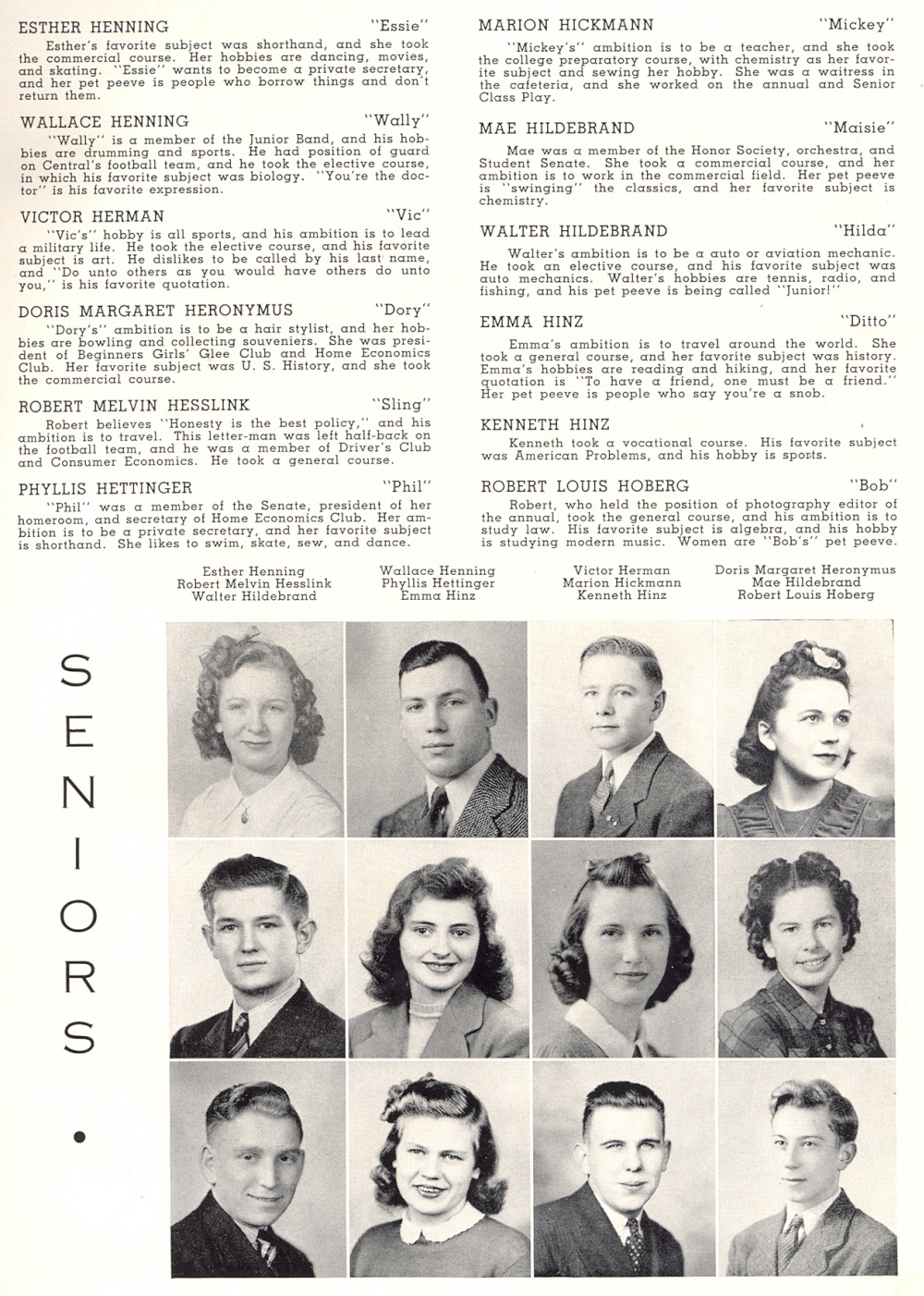 High School, Page 27: Esther Henning, Wallace Henning, Victor Herman, Doris Margaret Heronymus, Robert Melvin Hesslink, Phyllis Hettinger, Marion Hickmann, Mae Hildebrand, Walter Hildebrand, Emma Hinz, Kenneth Hinz, Robert Louis Hoberg.