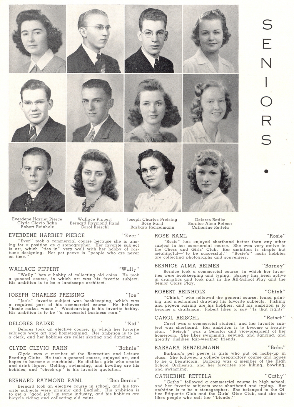 High School, Page 38: Everdene Harriet Pierce, Wallace Pippert, Joseph Charles Preising, Delores Radke, Clyde Clevio Rahn, Bernard Raymond Raml, Rose Raml, Bernice Alma Reimer, Robert Reinholz, Carol Reischl, Barbara Renzelmann, Catherine Rettela.
