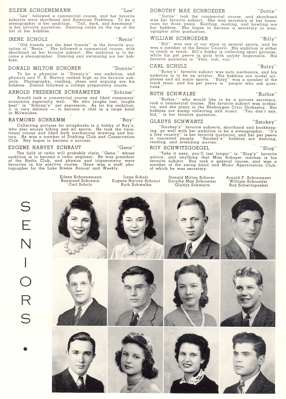 High School, Page 41: Eileen Schoenemann, Irene Scholz, Donald Milton Schorer, Arnold Frederick Schrameyer, Raymond Schramm, Eugene Harvey Schraut, Dorothy Mae Schroeder, William Schroeder, Carl Schulz, Ruth Schwalbe, Gladys Schwartz, Roy Schwitzgoebel.