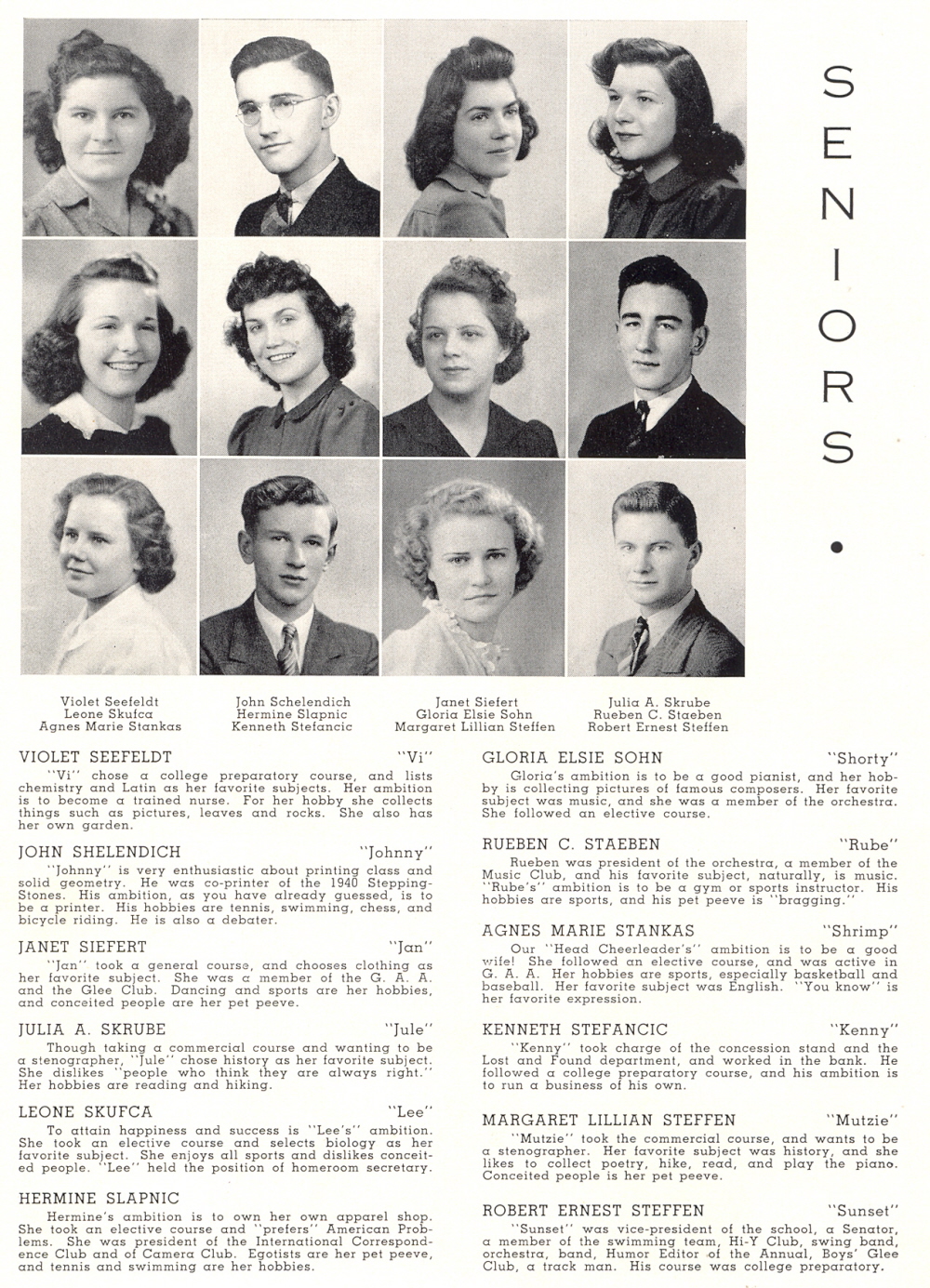 High School, Page 42: Violet Seefeldt, John Shelendich, Janet Siefert, Julia A. Skrube, Leone Skufca, Hermine Slapnic, Gloria Elsie Sohn, Rueben C. Staeben, Agnes Marie Stankas, Kenneth Stefancic, Margaret Lillian Steffen, Robert Ernest Steffen.