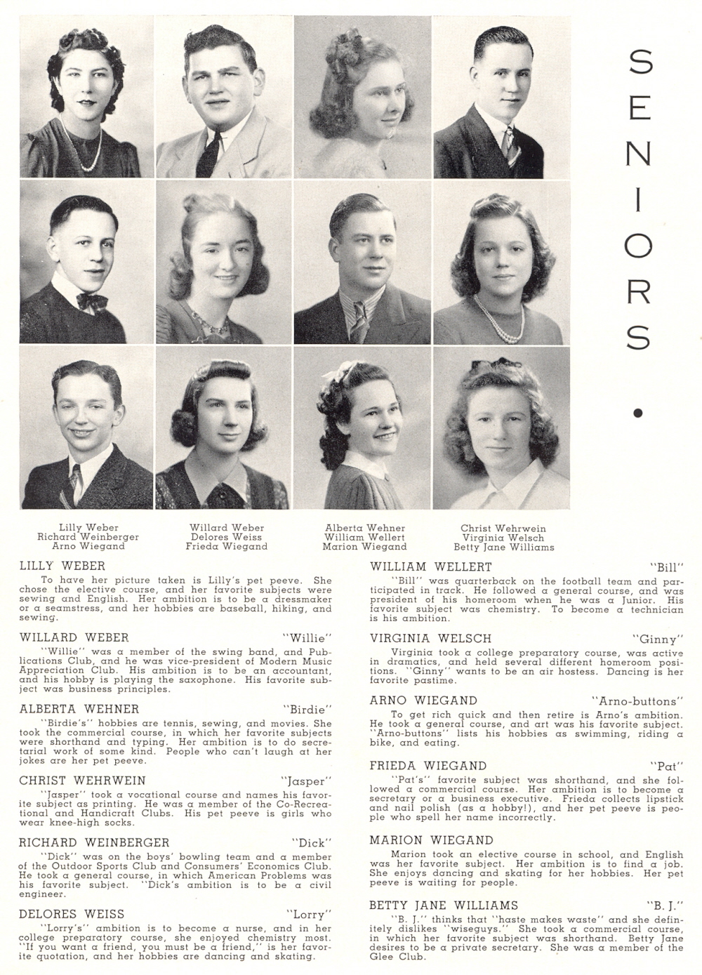1941 Sheboygan Central High School, Page 46: Lilly Weber, Willard Weber, Alberta Wehner, Christ Wehrwein, Richard Weinberger, Delores Weiss, William Wellert, Virginia Welsch, Arno Wiegand, Frieda Wiegand, Marion Wiegand, Betty Jane Williams.