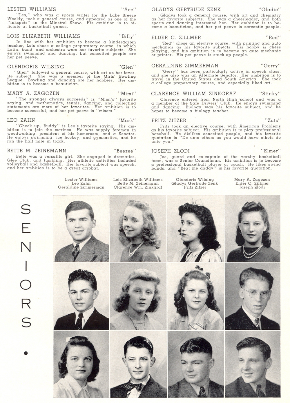 High School, Page 47: Lester Williams, Lois Elizabeth Williams, Glendoris Wilsing, Mary A. Zagozen, Leo Zahn, Bette M. Zeinemann, Gladys Gertrude Zenk, Elder C. Zillmer, Geraldine Zimmerman, Clarence William Zinkgraf, Fritz Zitzer, Joseph Zlodi.