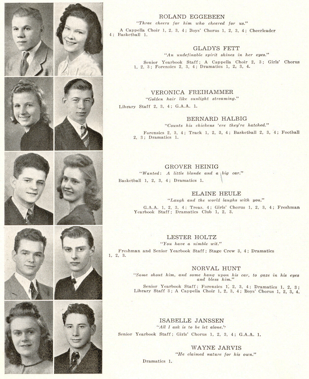 1941 Sheboygan Falls High School, Page 18: Roland Eggebeen, Gladys Fett, Veronica Freihammer, Bernard Halbig, Grover Heinig, Elaine Heule, Lester Holtz, Norval Hunt, Isabelle Janssen, Wayne Jarvis.