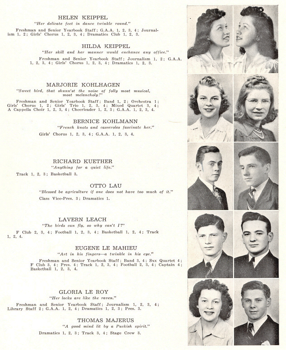 1941 Sheboygan Falls High School, Page 19: Helen Keippel, Hilda Keippel, Marjorie Kohlhagen, Bernice Kohlmann, Richard Kuether, Otto Lau, Lavern Leach, Eugene Le Mahieu, Gloria Le Roy, Thomas Majerus.