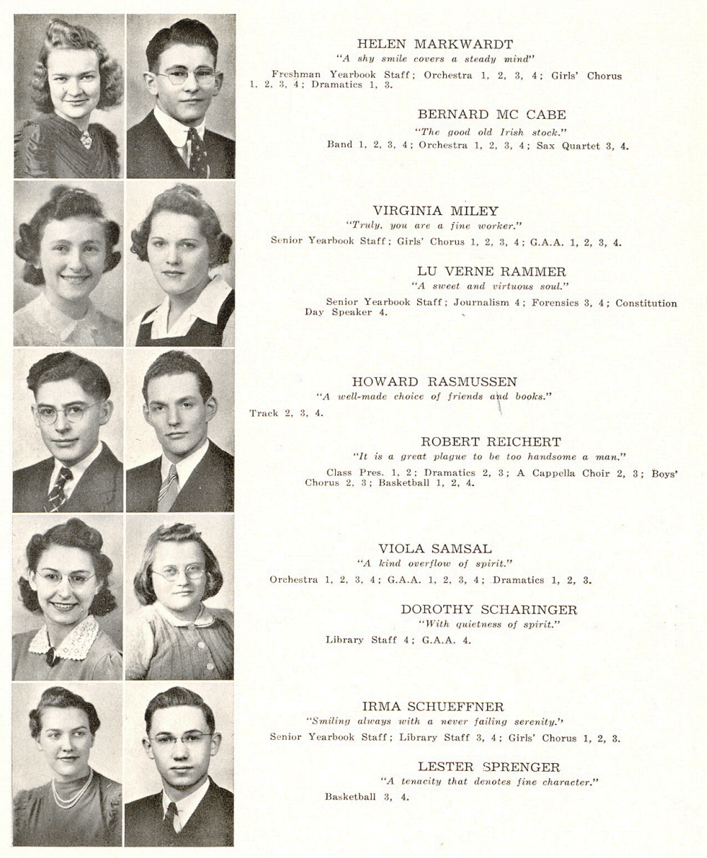 1941 Sheboygan Falls High School, Page 20: Helen Markwardt, Bernard Mc Cabe, Virginia Miley, Lu Verne Rammer, Howard Rasmussen, Robert Reichert, Viola Samsal, Dorothy Scharinger, Irma Schueffner, Lester Sprenger.