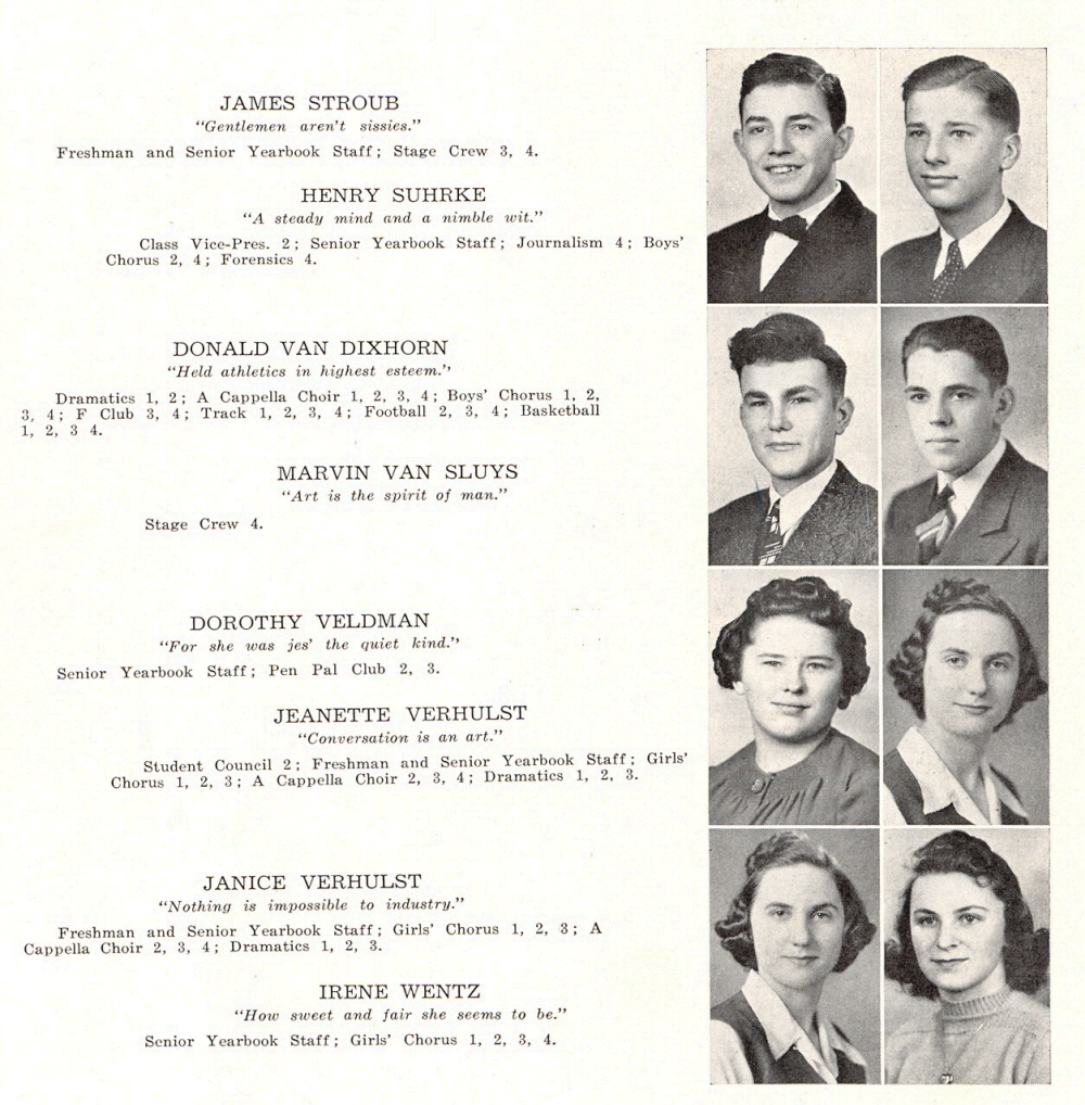 1941 Sheboygan Falls High School, Page 21: James Stroub, Henry Suhrke, Donald Van Dixhorn, Marvin Van Sluys, Dorothy Veldman, Jeanette Verhulst, Janice Verhulst, Irene Wentz.